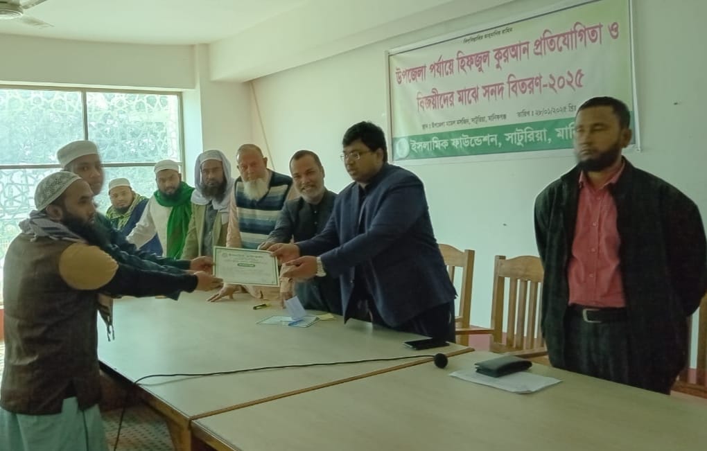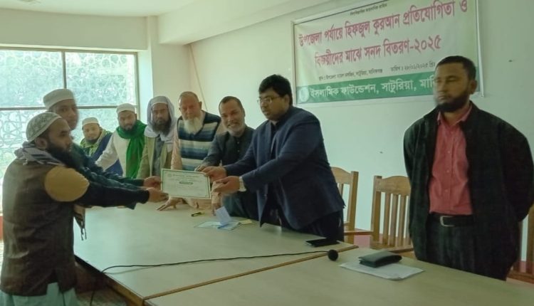 মানিকগঞ্জের সাটুরিয়ায় উপজেলা পর্যায়ে জাতীয় হিফজুল কুরআন প্রতিযোগীতা ২০২৫ এর বিজয়ীদের মাঝে সনদ বিতরণী অনুষ্ঠান মঙ্গলবার দুপুরে মডেল মসজিদে অনুষ্ঠিত হয়েছে।