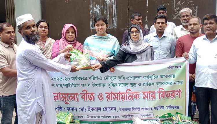 মানিকগঞ্জের সাটুরিয়ায় ক্ষুদ্র ও প্রান্তিক কৃষকদের মাঝে প্রণোদনা কর্মসূচির আওতায় বিনামূল্যে তিল ও পাটের বীজ বিতরণ করা হয়েছে।