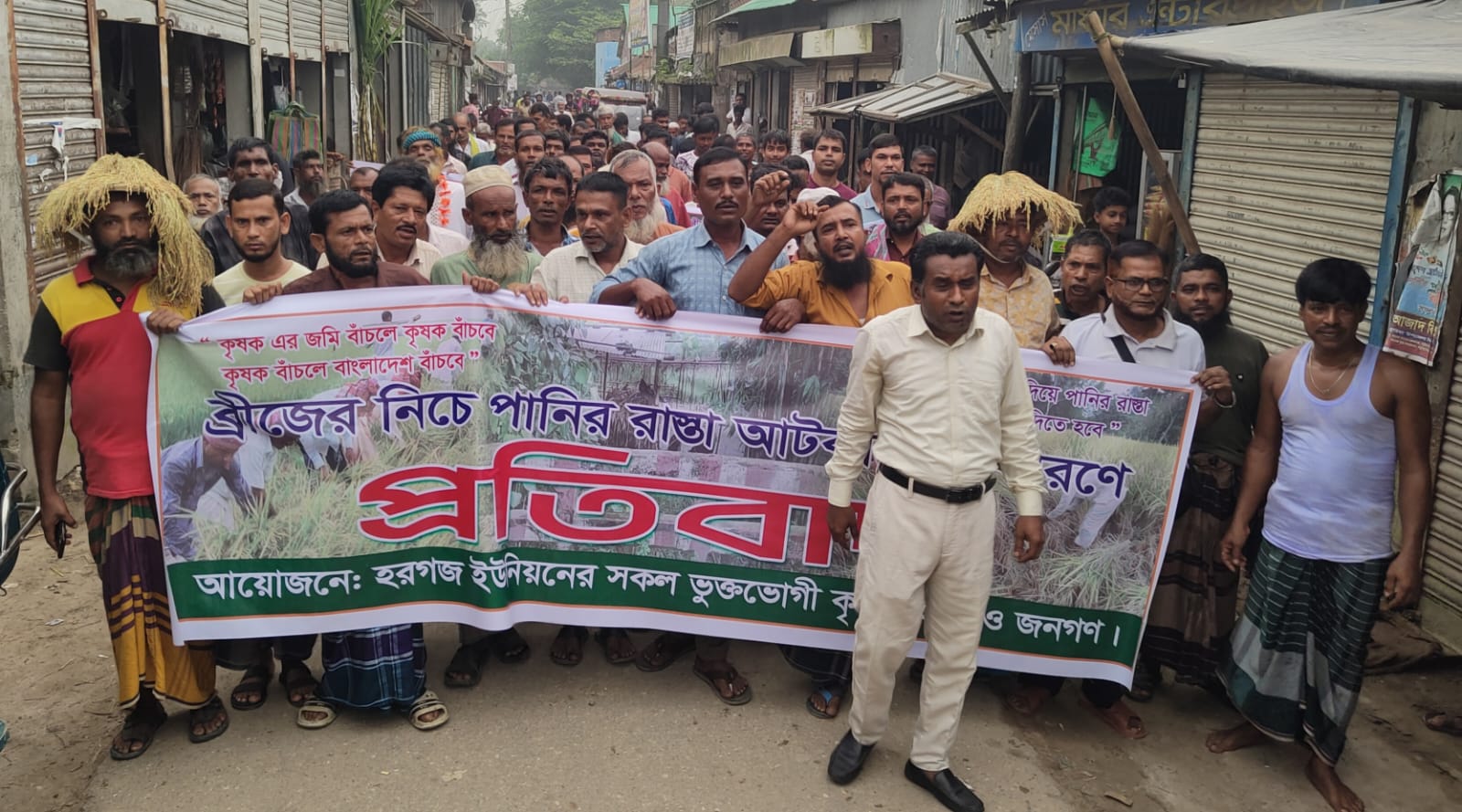 মানববন্ধনে কাজী শহিদুল্লাহর নেতৃত্বে বক্তব্য রাখেন স্থানীয় বাসিন্দা বেলাল হোসেন, কৃষক সাইদুর রহমান ও দেলোয়ার হোসেন। তারা অভিযোগ করেন, হরগজ মোড় থেকে বাজার সড়কের বালুর চর নামক স্থানে অবস্থিত একটি সেতুর উত্তর পাশে দীর্ঘদিন ধরে পানি নিষ্কাশনের একটি স্বাভাবিক পথ ছিল। কিন্তু ৫ আগস্টের পর হঠাৎ করে রাতের আঁধারে ওই নিষ্কাশন পথটি মাটি দিয়ে ভরাট করে দেওয়া হয়।